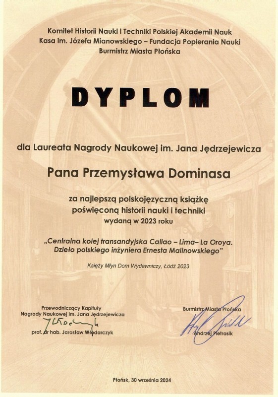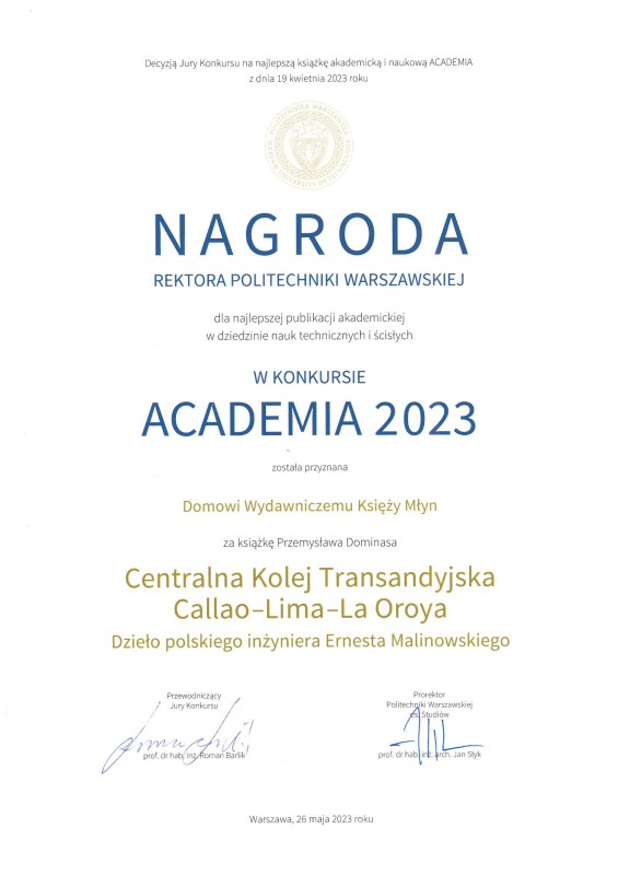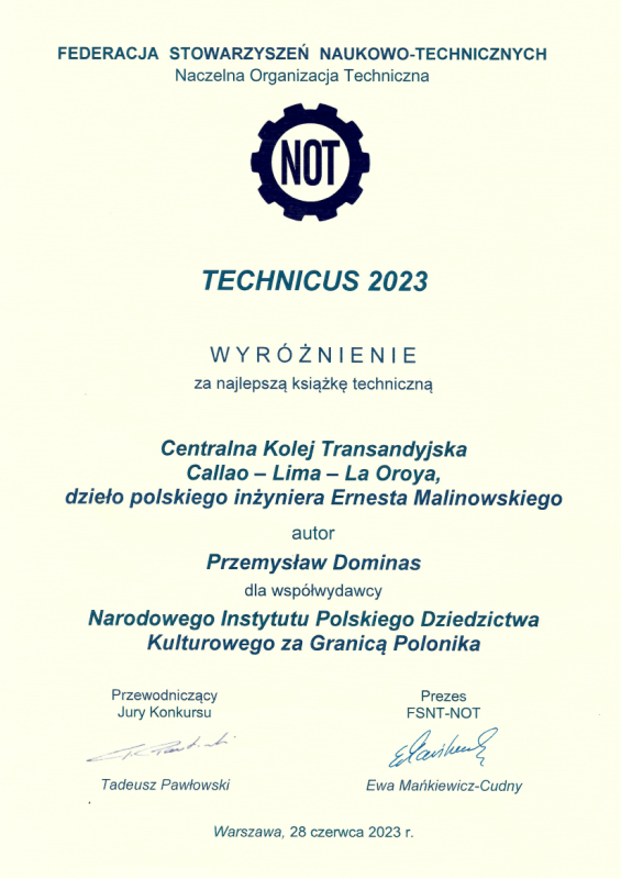 O tych i innych historiach związanych z tym wielkim wyzwaniem technicznym można dowiedzieć się z książki Przemysława Dominasa Kolej Transandyjska – Callao-Lima-La Oroya, dzieło polskiego inżyniera Ernesta Malinowskiego, wydanej przez Instytut Polonika i Dom Wydawniczy Księży Młyn.